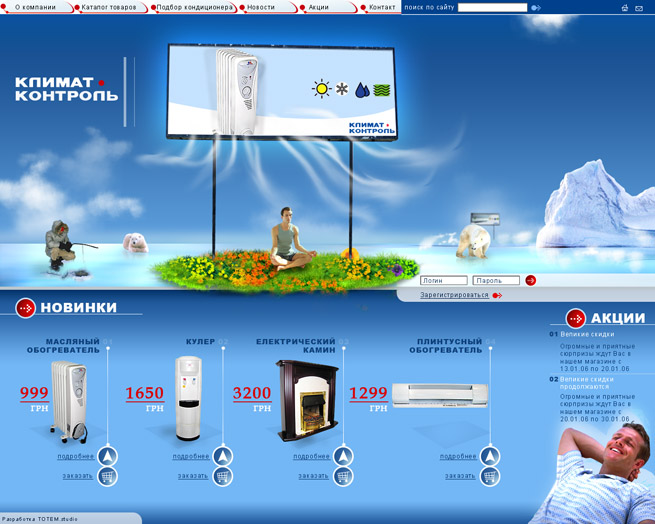 Мы разработали этот ресурс в довольно яркой концепции, наполнив его многими затейными выдумками, что всё вместе и создаёт благоприятную атмосферу сайта. Например, главных страниц получилось две по умолчанию, и на одной из них — занятие йогой на райском островке прямо под экологически «здоровым» обогревателем. Небольшой нюанс: вокруг островка — лёд, белые медведи и один эскимос.