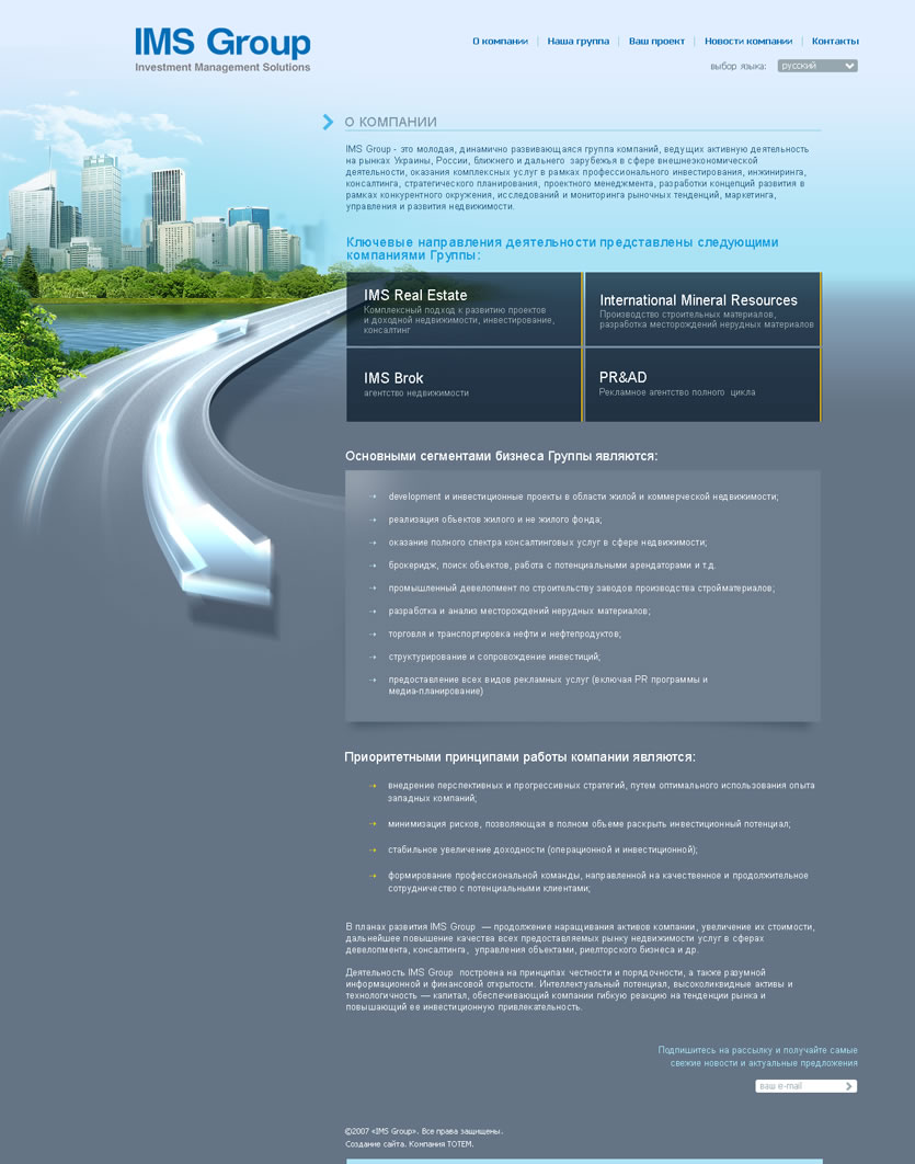 На стартовой странице сайта изображен город, который является как производителем, так и потребителем услуг холдинга.
